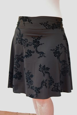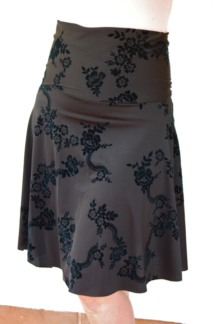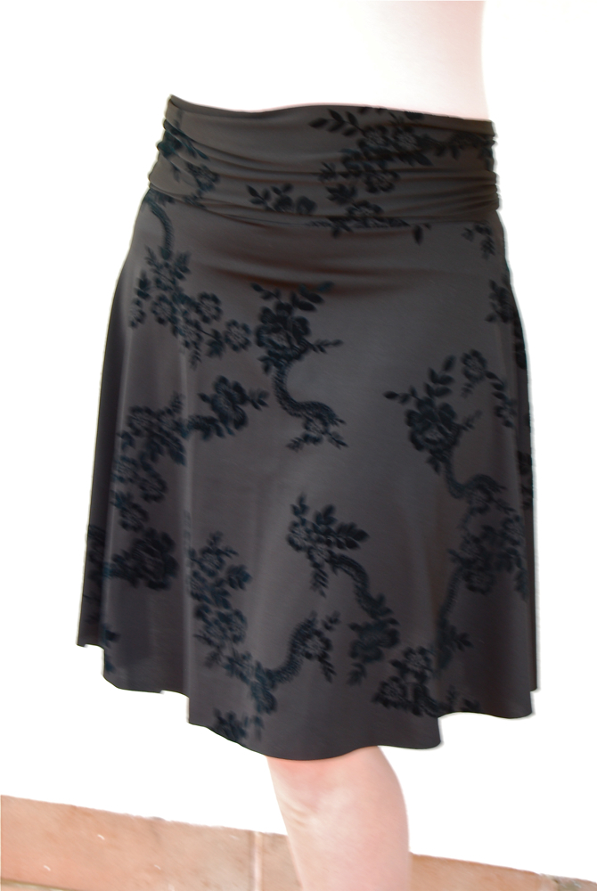Hellloooo there everyone. You’re probably not expecting to hear much from me since The End. But I am alive and well and arguing with talking to Adrianna more or less every day. We are having great debates over skirts. And while my sewing machine, serger, fabric, sanity, and supplies are in transit from one continent to another, I *did* manage to plan ahead a bit for skirt week. So I’d like to introduce you to my current favorite skirt. It’s made from some sort of super stretchy poly that’s almost swimsuit-y. It has a lightly flocked pattern that isn’t nearly as contrast-y as these photos make it look.