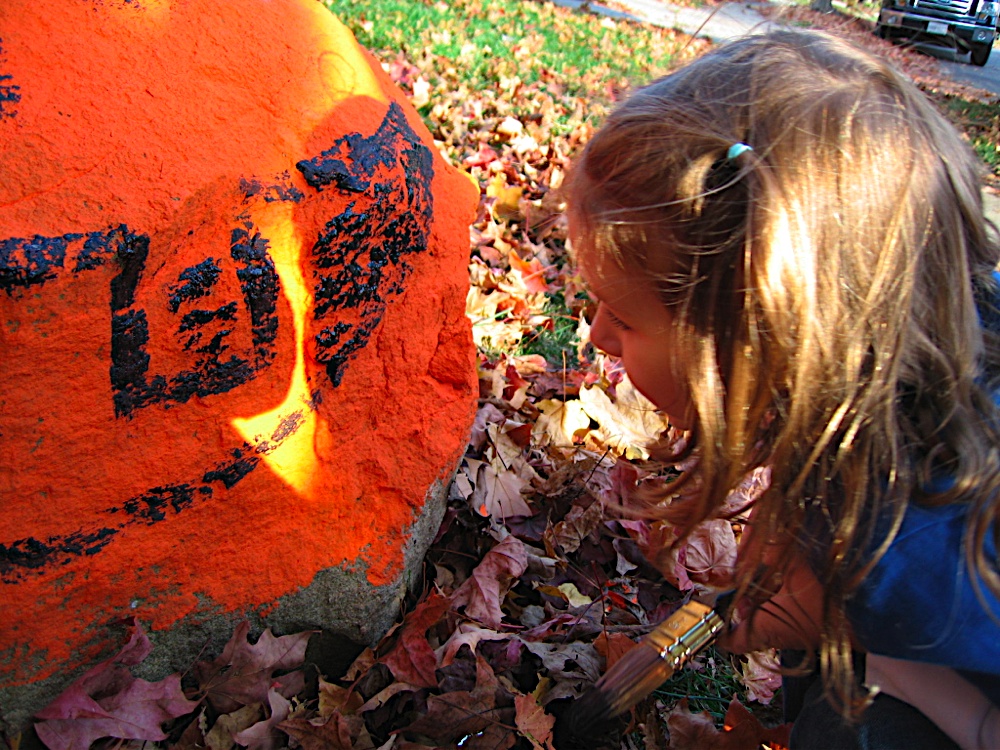 Especially when we have a large blank canvas that begs to be pumpkinified. Like this one that has been calling out to me since I first saw our house for sale, saying “Paint me! Paint me! PAINT ME!” It’s in front of our house, so I’ve literally looked at it every single day, thinking about painting it.