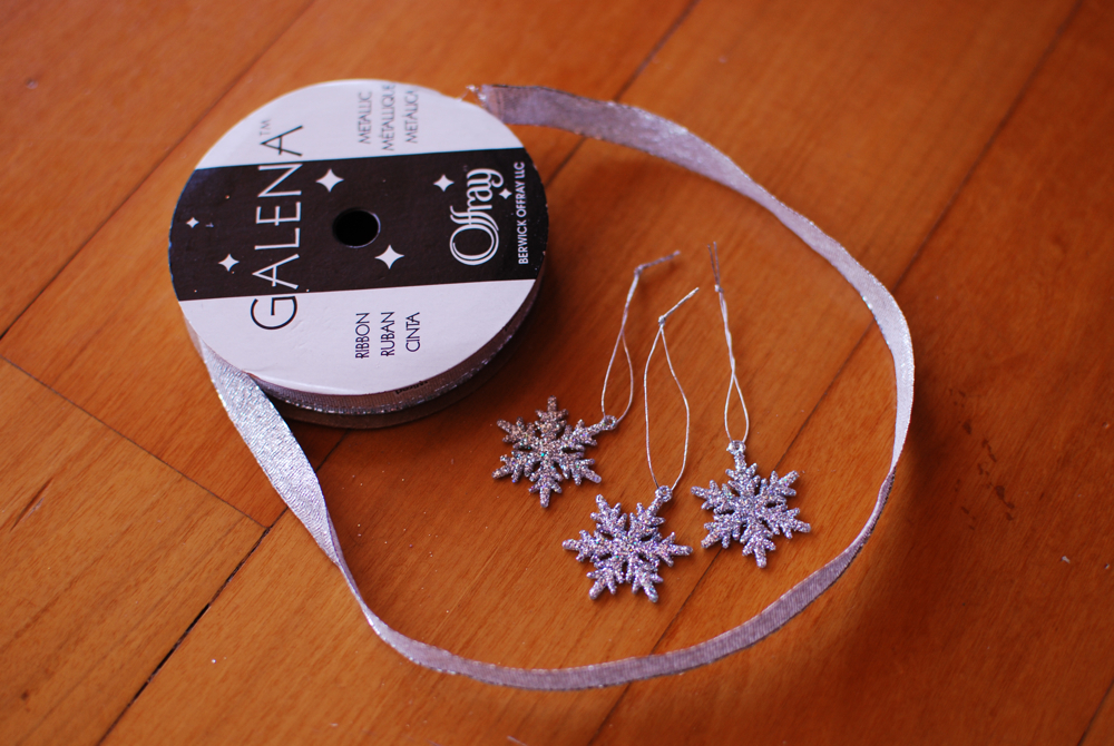 Get your ribbon and tiny ornaments on stand-by. I chose itsy bitsy snowflakes, but I saw all kinds of teeny ornaments to choose from at the craft store (in America).