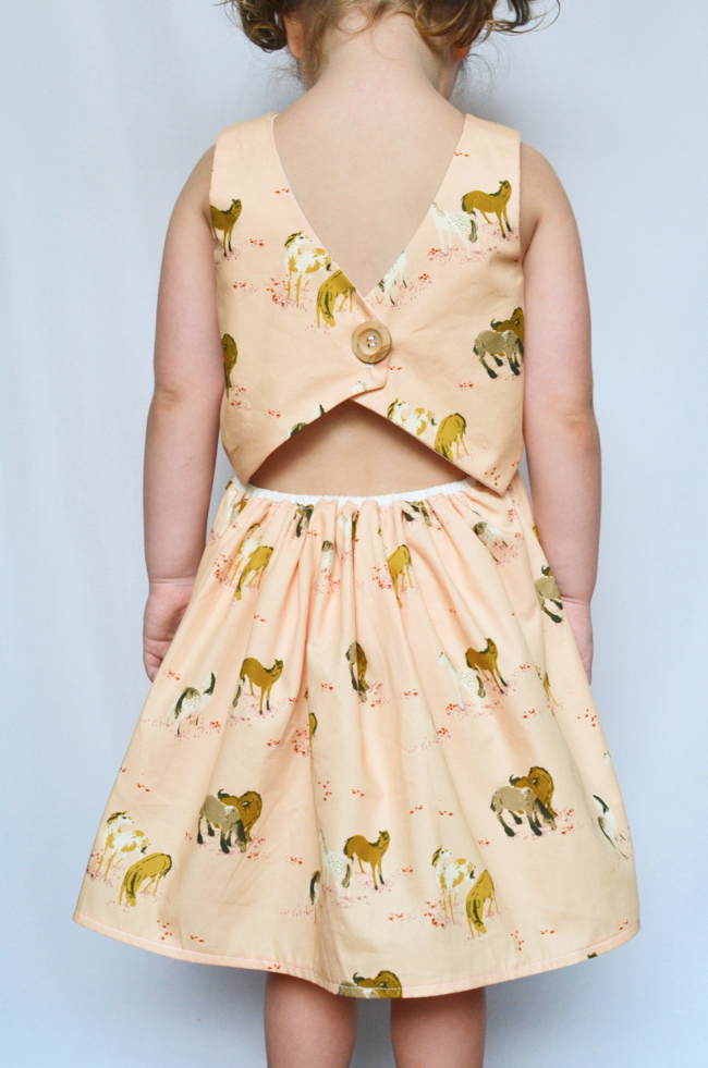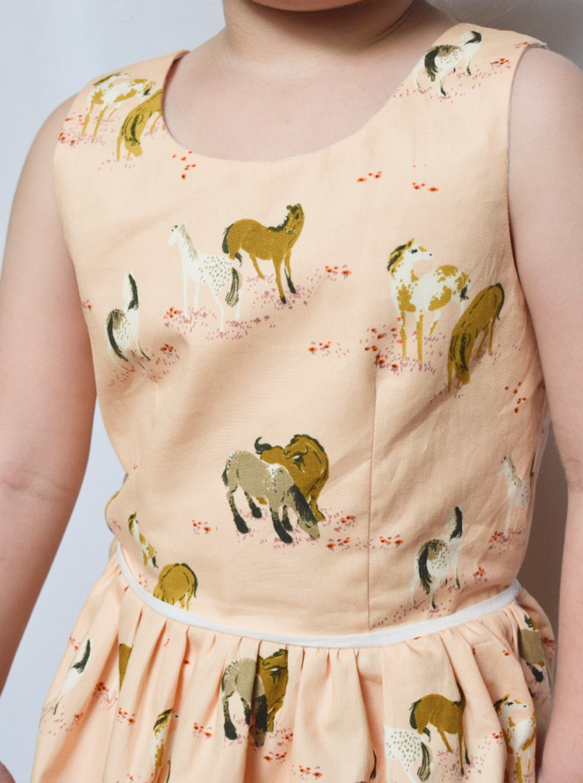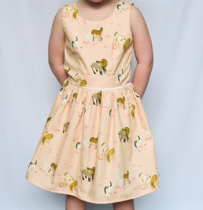 Our sweet little friend turned 4 last weekend and had a party at our local equestrian center where the kiddos got to feed horses and take little pony rides. I thought it would be fun to make her a dress to tie into the theme, and I just happened to have this ages-old Heather Ross fabric in the stash. Kinda perfect, huh?